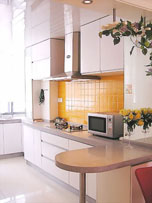 消毒柜:消毒柜設(shè)計(jì)在水槽與灶具的中間,在水槽洗滌過(guò)碗筷后放在右手邊的消毒柜里進(jìn)行消毒。烹飪時(shí)也可以十分方便地從左手邊的消毒柜里拿碗盤。