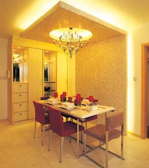 餐廳是一家人進行溝通與交流的重要場所。中國人的飲食中非常講究色、香、味、形。色與形是為了悅目,因此就少不了餐廳照明的襯托。恰當?shù)牟蛷d照明不僅能為主人營造出舒適、淡雅的進餐環(huán)境,而且將主婦烹飪的菜肴襯托得色、形俱佳,使家人在進餐中得到美的享受。