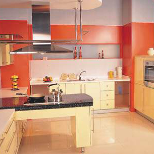 這是因為廚房家具色彩的色相和明度可以左右使用對象的食欲和情緒,而廚房的使用對象的家庭人口、成員結構、文化素質又決定了它對廚房家具色彩的喜好程度,因此對于家具色彩的選擇應從以上幾個方面來考慮。人在廚房中的主要行為有食品加工、烹飪等過程,在這個過程中要求保證食品加工、烹飪等過程衛(wèi)生、安全,在加工食品的過程中能刺激人的食欲,使人愛吃。