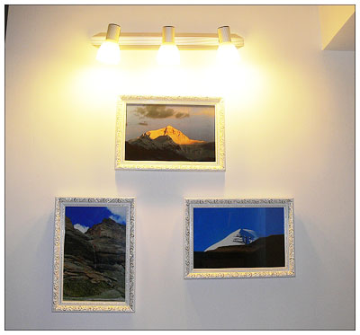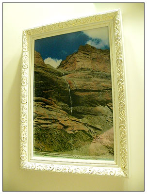 這里可以窺見爸爸的電腦工作臺(藏在大墻柜里面的),還有他房間上面的得意之作,九寨溝的瀑布,金色相框燈照效果輝煌的說,我總是遺憾青山碧水可惜沒有配上**的藍天。