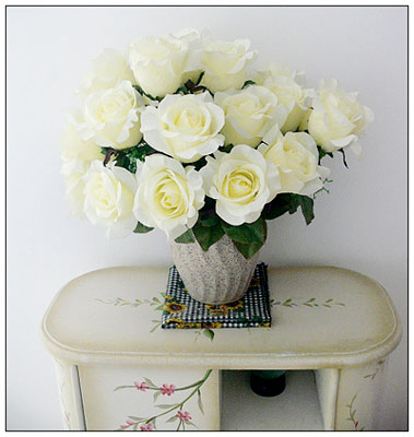 柜上擺設的花瓶和花都采購自花卉市場,花瓶顏色低調(diào),而且價錢也不貴。花束采自花卉市場的婚宴小店,淡淡的淺黃色熱烈盛放,9元一束買了3束,無論是白天還是夜間,要非常仔細辨認才看得出是仿真花哦。