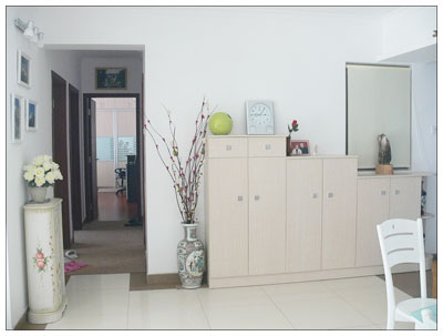 過道全景,進門直通的通道對著墻。高低有致的是訂做的鞋柜。市面上賣的鞋柜老貴,而且規(guī)格還不太適合偶家,于是訂了一個,整套打造1400多,省錢之余還利用空間。