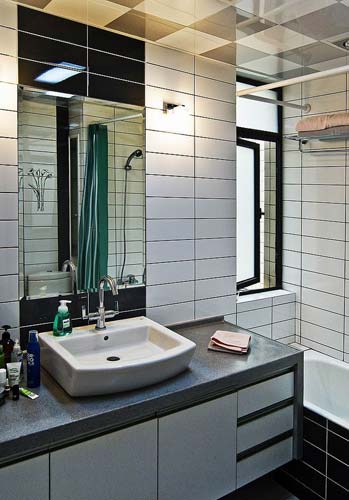 與淋浴間相對的墻面完全使用了鏡子,擴大了小浴室的空間視覺感,鏡子前面做成了浴室架,上面安裝了臺式盆,這里可以梳洗打扮,邊上的綠色植物,成了整體設(shè)計中引人注目的亮點,也為環(huán)境帶來了生氣。
