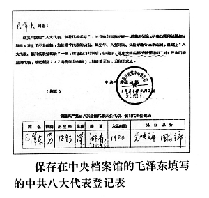 概要: 圖為保存在中央檔案館的***填寫的**八大代表登記表在中央檔案館保存的關(guān)于**八大檔案中,有一份***親自填寫的**八大代表登記表。這個(gè)登記表上關(guān)于入黨時(shí)間的一欄中,清清楚楚填寫的是1920年。這就是說,***的入黨時(shí)間是1920年。有的讀者對此不是很理解,他們問,中國共產(chǎn)黨是1921年成立的,為什么***的入黨時(shí)間是1920年呢。
