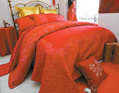 床兩旁高高地掛上一對中國結(jié),如兩個鮮紅的蠟燭,床上再鋪上那張揚的大紅色,精致的繡花圖案上是一幅龍鳳變形圖,令人不禁想起了喜慶的洞房花燭夜,富有濃濃的中國風情。以前的女子待嫁之時會整天呆在閨房里為自己做刺繡,從手帕、新衣、枕套到被面,一針一線,縫的都是少女喜悅的心情,這喜悅?cè)缃窬吞S在枕間被里。