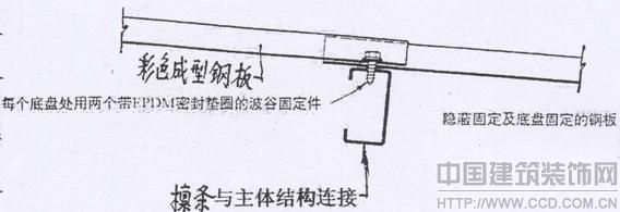 2.制作安裝方便快捷:成型幕墻的板塊,彩鋼板經(jīng)冷作加工,其剛度優(yōu)于同厚度的鋁板。圖1表示彩鋼板幕墻安裝示意圖。