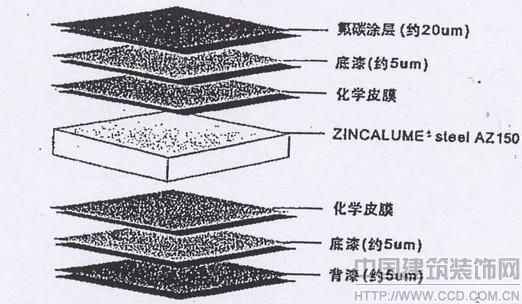 常熟市沃爾碼商業(yè)廣場項目金屬幕墻所采用的彩色鋼板為廣州博思格來實公司所生產(chǎn)的彩鋼板,其具有以下特點:彩鋼板抗腐蝕性能、防潮性能、抗粉化性能、抗化學(xué)性能均達(dá)到了一個較高水準(zhǔn)。博思格來實公司的彩鋼板其基板為優(yōu)耐板,系鍍鋁鋅合金鍍層。涂復(fù)前進(jìn)行特有的抗銹蝕化學(xué)鍍膜處理;正面底漆層,涂復(fù)厚度5μm的聚酯底漆;鋼板正面涂層采用KYNARORPVD涂層厚度為20μm;鋼板背面淺綠色涂層,其厚度為5μm;背面底漆層為5μm厚環(huán)氧基樹酯。涂層結(jié)構(gòu)如圖2。