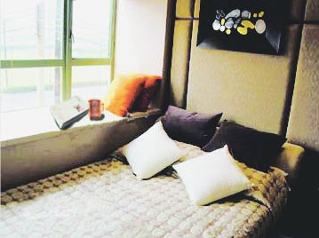 女人天生愛做夢,擁有一個晴觀落日、夜觀星空的大飄窗是不少女性的夢想。現(xiàn)在,女人們可以把飄窗掛上粉色或者紫色的碎花棉布窗簾,擺上一盞香熏燈,旁邊放一個小小的沙發(fā),或者鋪上軟軟的地毯,放上幾個可愛的抱枕,好好想象一下過去和未來。還可以為飄窗臺做一套漂亮的柜子,再在窗臺上靠邊三分之一的空間里,魔術(shù)般變出一張精巧的梳妝臺,收羅全部的美麗武器。這樣,一個屬于自己的私密空間就產(chǎn)生了。有了這些,抱著布絨娃娃慵懶的窩上一個下午,找找少女時的初戀吧!