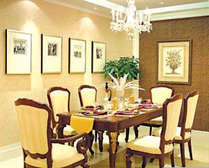 樣板間3與小區(qū)的整體風(fēng)格一致,餐廳也是歐式風(fēng)格,一般來說更受年輕人喜歡。吃西餐占地方,所以餐桌比較大,而且可以供六個人就餐,普通的朋友聚會也可以滿足了。