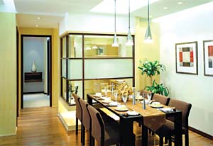 在珠江帝景的樣板間里就有幾個以小見大的例子。有一種戶型是主臥和主衛(wèi)相對,設(shè)計師就在臥室和衛(wèi)生間之間加了一個兩邊都可以推開的衣帽柜,這樣既方便換衣服,又增加了私密性。在衛(wèi)生間這邊的柜門是用玻璃做成,給人一種空間寬敞的錯覺;而在臥室這邊的柜門卻用毛玻璃或者木頭,主要是考慮到人的身體規(guī)律,也為了避免晚上被自己在鏡中的影像嚇到。