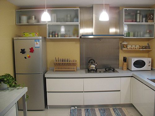 (2)L型:將清洗、配膳與烹調(diào)三大工作中心,依次配置于相互連接的L型墻壁空間。最好不要將L型的一面設計過長,以免降低工作效率,這種空間運用比較普遍、經(jīng)濟。