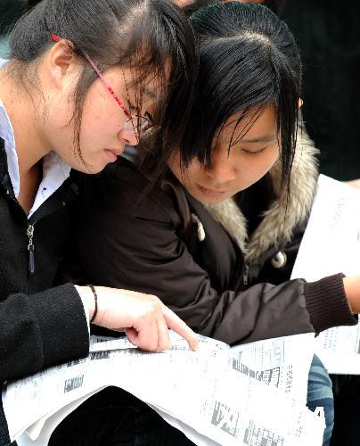 資料圖片:2月27日,兩名女大學生在了解用工信息。當日,由福州市婦聯(lián)、市人事局等單位聯(lián)合舉辦的2009年福州市女大中專畢業(yè)生就業(yè)供需見面會在福州金山人才交流中心舉行,60多家用人單位提供2000多個文秘、財務、護理等適合女性就業(yè)的工作崗位。新華社記者 張國俊攝