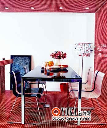 紅色馬賽克鋪設(shè)的太空艙般的餐廳,極具設(shè)計(jì)感。