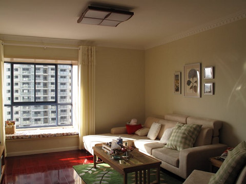 不喜歡電視背景墻就沒做 墻面是多樂士的雪中百合,網(wǎng)購電視柜是紅蘋果,喜歡墻上的隔板。沙發(fā)是掌上明珠,看著厚實,其實蠻輕飄。地板安信的鐵蘇木,打折時買的,顏色真是紅彤彤。茶幾和電話幾是迪諾雅的,家具差不多買齊了才發(fā)現(xiàn)這個牌子,實木的很簡潔。