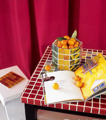 桌面是平的,常見(jiàn)的形狀是方或者圓,用拼貼墻面的方法拼貼桌面,應(yīng)該不是很難的事。不用敲碎,因?yàn)槊娣e比較大,可以自由設(shè)計(jì)圖案,或者干脆就放滿桌的數(shù)字或者字母,如果是餐桌,就一定要選增加食欲的鮮艷顏色。玻璃馬賽克使桌面顯得干凈透亮,也很好清理。