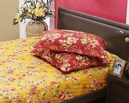 黃色為底床罩+紅色花朵靠枕一幅田園氣息在臥室洋溢。以一種恬淡陶然的田園情懷再現(xiàn)精致浪漫的都市品質(zhì)生活:聞著空氣中彌漫著愛的氣息,那一份溫馨,那一份感動,盡在這一瞬間??臻g,因?yàn)榈玫结尫哦始姵省?