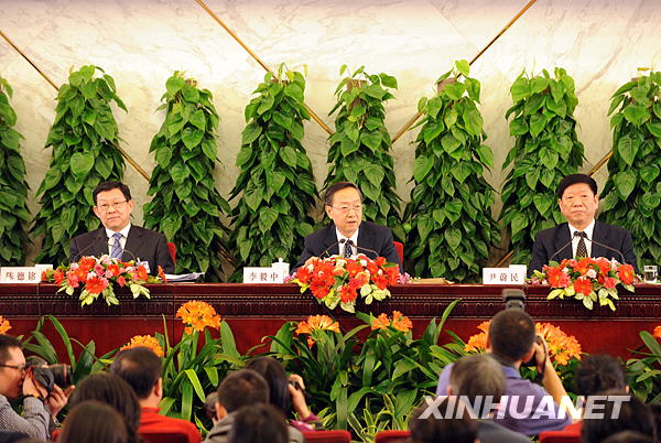 3月10日,十一屆全國(guó)人大二次會(huì)議舉行記者會(huì),工業(yè)和信息化部部長(zhǎng)李毅中、人力資源和社會(huì)保障部部長(zhǎng)尹蔚民、商務(wù)部部長(zhǎng)***答記者問(wèn)。新華社記者陳樹根攝