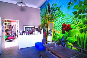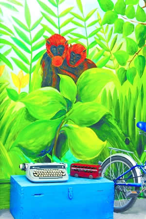 一走進(jìn)王瑩瑩的家,猶如置身在亞馬遜河流域的森林公園,茂盛的熱帶植物隨處可見,奇特詭異的花草,明艷肥碩。不過這些景致是畫在布上和墻壁上的,因?yàn)檫@個家的女主人王瑩瑩就是一名出色的布藝設(shè)計(jì)師。在設(shè)計(jì)這套居室的時候,她就打算用布藝、涂鴉、花草把這個略顯冷硬的家柔軟起來,讓家的每一個角落都有飄動的顏色流過。