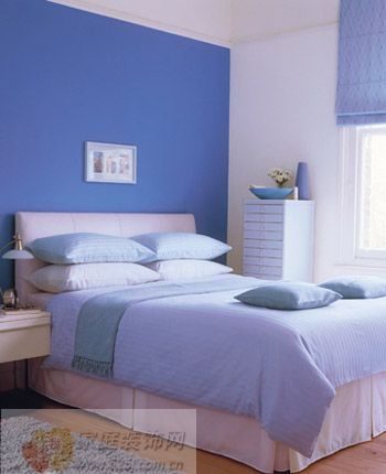 主題墻面為色彩鮮明的水藍(lán)色,墻壁正中是白色小像框,其余墻壁采用灰色,很好地襯托了主墻面。