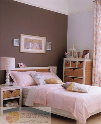床頭主墻面以穆哈咖啡色打底,構(gòu)成主基調(diào),墻面正中是白色長(zhǎng)方像框和兩個(gè)微型像框。