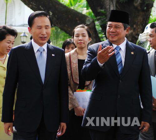 印尼總統(tǒng)府,印尼總統(tǒng)蘇西洛(前右)歡迎韓國(guó)總統(tǒng)李明博(前左)到訪。當(dāng)天,李明博抵達(dá)雅加達(dá),開始對(duì)印尼進(jìn)行為期3天的訪問(wèn)。新華社記者岳月偉攝