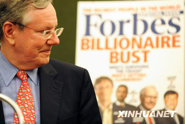 3月11日,《福布斯》雜志總編輯史蒂夫·福布斯在美國(guó)紐約出席新聞發(fā)布會(huì)。當(dāng)天,《福布斯》雜志在紐約總部舉行新聞發(fā)布會(huì),公布2009年度全球富豪榜。受金融危機(jī)的影響,2009年度上榜的億萬富豪人數(shù)從上年的1125名下降至793名,這是自2003年以來上榜富豪人數(shù)首次出現(xiàn)下降。上榜億萬富豪們的財(cái)富總額也出現(xiàn)大幅縮水,比爾·蓋茨因?yàn)樨?cái)富縮水較少,以400億美元身價(jià)重登全球富豪榜榜首。新華社記者 申宏攝