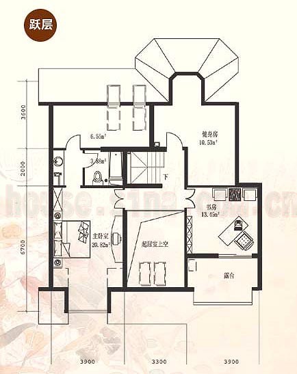 3、動靜分區(qū),樓下公共活動空間,樓上專為男女主人設(shè)計,一邊是主臥、干濕分離衛(wèi)浴、更衣室,一邊是書房、健身房、露臺,私密的空間確保生活不受干擾。