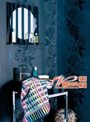 優(yōu)雅的復(fù)古花紋就在盥洗區(qū)的墻面上,雖然也是黑色的,亮光效果卻能在亞光底色上脫穎而出,為黑白基調(diào)的衛(wèi)浴空間增添了一份優(yōu)雅的味道。彩條圖案的毛巾也不可缺少,因?yàn)樗坏切l(wèi)浴生活的必需品,同時(shí)又不失裝飾性,為視覺(jué)增添欣賞點(diǎn)。
