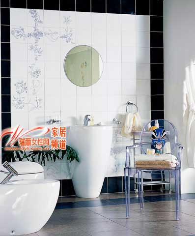 在配有淋浴和浴缸的衛(wèi)浴間里,用黑白兩色小馬賽克設(shè)計(jì)地面,拼成黑色和白色相間的水波紋理,整間浴室就化身為水上世界,浴缸、潔具、家具都好像漂浮在水面上,而墻壁上的花紋彩繪,令衛(wèi)浴生活變得新奇又浪漫。