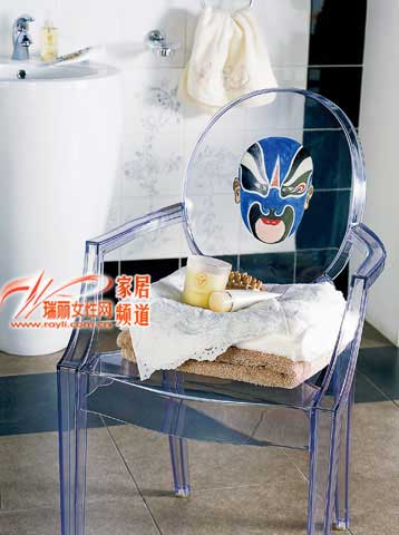 快樂(lè)需要自己制造。透明樹(shù)脂材質(zhì)的坐椅靠背上,添加一張臉譜圖案后,立刻擁有了情緒和表情,擁有了生命力,把挑選好的毛巾和浴巾放在上面,隨時(shí)準(zhǔn)備為自己服務(wù)。