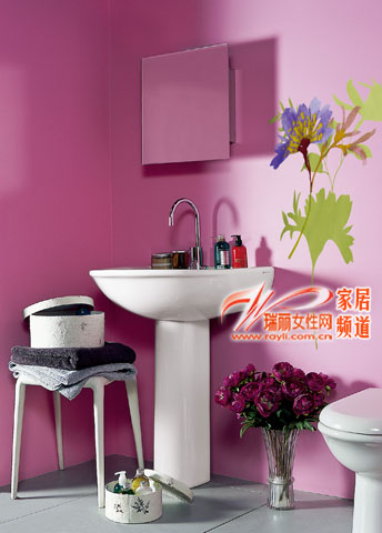 粉色油漆粉飾過(guò)的墻面,顏色雖然亮麗,但單一色調(diào)的墻面依然給人狹小感,而用防水性好的漆料在墻面繪制一幅綠色的花枝圖案后,墻面像是被注入了生命活力,充滿了立體感,空間也覺(jué)得比之前變大了一些。