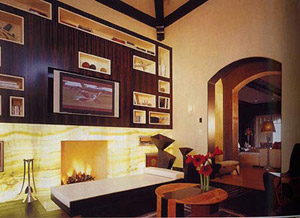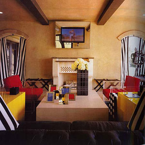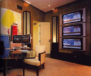 書房:時(shí)髦中顯現(xiàn)精致。事故男人在此德三條線索,6個(gè)展示世界各國首都的玻璃墻柱,價(jià)值75萬美元的Hans Hofmann繪畫、3臺(tái)索尼等離子電視、分別用英語、日語和西班牙語播音。