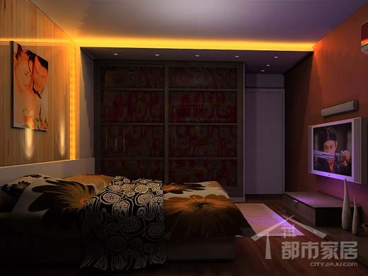 鐵銹紅色的電視背景墻,杏色的壁紙前后呼應(yīng),同樣的暖色系列,卻增添了些許原始的野性味道。配合同樣暖色的床品,整個臥室渾然一體,既溫馨、甜膩,又有幾分神秘的色彩。