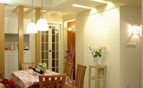 概要: 1、餐廳以白色為主,整體看起來清清爽爽。2、避免空間色彩單調(diào)感,采用了碎花瓣的荷葉邊桌布,更突出了空間美。在軟裝上也采用同色系裝飾品,視覺感覺很不錯(cuò),用淡藍(lán)色的薄紗做門簾既增添了浪漫又增加了視覺。