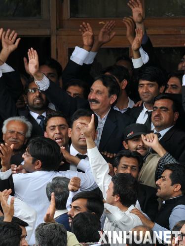 3月16日,在巴基斯坦伊斯蘭堡,喬杜里(中、留胡子未系領(lǐng)帶者)和律師們參加慶?;顒?dòng)。巴基斯坦總理吉拉尼16日發(fā)表電視講話,宣布恢復(fù)喬杜里巴基斯坦最高法院首席大法官的職務(wù)。喬杜里在2007年11月巴前總統(tǒng)穆沙拉夫?qū)嵭芯o急狀態(tài)時(shí)被解職。 新華社記者饒博攝