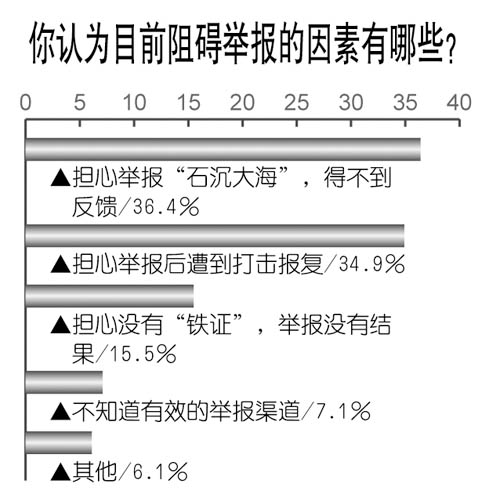 調(diào)查中,公眾給出的阻礙舉報(bào)的因素排序依次為:擔(dān)心舉報(bào)“石沉大海”,得不到反饋(36.4%);擔(dān)心舉報(bào)后遭到打擊報(bào)復(fù)(34.9%);擔(dān)心沒有“鐵證”,舉報(bào)沒有結(jié)果(15.5%);不知道有效的舉報(bào)渠道(7.1%)。