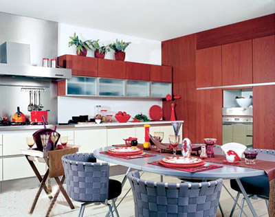概要: 中國紅餐廚用具代替普通餐廚用具,在奧運(yùn)來臨之際是再恰當(dāng)不過。餐桌是布置的重點(diǎn),需要用紅色布藝、餐具、飾品營造出新春佳節(jié)的喜悅感?!〔贾枚嗳司筒涂臻g 橢圓形餐桌+移動(dòng)置物架+紅色餐具飾品配有橢圓形餐桌和移動(dòng)置物架的廚房,可容納多人用餐,是大家庭節(jié)日聚餐的理想場地,雖然餐桌椅的顏色、烹飪區(qū)的不銹鋼金屬顏色有點(diǎn)冷,不過,巧用中國紅就能把這兩處的色彩提亮起來。
