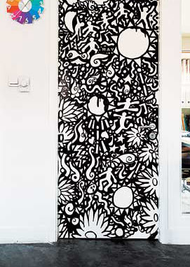 黑白線描漫畫涂鴉的門,讓門也成為一件可欣賞的藝術品。