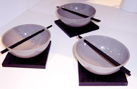 更值得一提的是這家店里的調(diào)料瓶的設計,完全顛覆了傳統(tǒng)瓶瓶罐罐給人的單調(diào)和油膩的感覺。有的是兩個等高的亞光錫制圓柱體小容器立在胡桃木的木制底托上,造型和顏色的搭配表現(xiàn)出明顯的西方設計的嚴謹和藝術性。兩個小容器的頂部鑿上幾個小孔,就是兩個精致的鹽罐和胡椒罐。還有的是兩外立蛋式的小圓容器,同樣的財質(zhì)和色澤中間可以分開,也是放調(diào)味品的。還有的乍一看是橢圓柱體的白色瓷瓶,再一看,原來是兩個日月形狀疊加的,上端也有著同樣的小孔,也是兩個漂亮的調(diào)料瓶。也有的是兩個扁平蛋形的小白色瓷器,色澤盈潤,造型精致,有著東方設計的韻味,上面也有幾個小孔,也是調(diào)味瓶。這些小瓷器下面都有胡桃木的底墊,放置在桌上不失為精致的小飾品,而裝上了調(diào)味道料,就成了功能性極強的調(diào)味瓶,這樣的家飾品,哪個愛美的家庭主婦會不喜歡呢?
