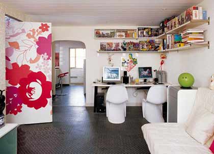 這里不得不提一些主人的得意之作。首先是那道神秘的大門,它的艷麗、獨(dú)特、趣味,讓我們不得不一再驚嘆楊賽文的創(chuàng)意。楊賽文說,這道大門的靈感來自于日本偵探漫畫中的一集:《密室案件》。一扇轉(zhuǎn)門,隱于墻中,輕推旋轉(zhuǎn),兩個(gè)世界。這道大門是連接臥室與客廳的重要環(huán)節(jié)。因?yàn)殚T的尺寸太大,而旋轉(zhuǎn)門又涉及太多復(fù)雜的物理原理,加之大門的旋轉(zhuǎn)轉(zhuǎn)軸,及用做固定大門用的隱形磁鐵安裝等等,都成了裝修時(shí)的棘手問題。