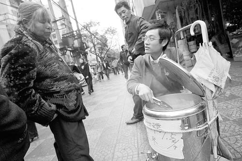 2月16日,重慶,從大學房地產(chǎn)專業(yè)畢業(yè)的曾天才賣了3年房子后,走上街頭,賣起了玉米。曾天才說:“大學畢業(yè)賣玉米,我并不覺得是一件難堪的事情,而是對自己的一種歷練。我想學一門技術,以后自己創(chuàng)業(yè)?!?圖片來源:重慶晨報