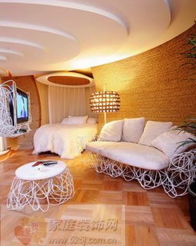 沙發(fā)、床都是定做的,主人很細(xì)心地把它們的支腳都配成了白色鋼絲纏繞的款式——整個(gè)房子如同大號的蠶繭,里面怎么能夠少了蠶絲呢?而電視的處理更值得稱道:省卻了大規(guī)模電視背景墻的空間,將它用鐵絲支架吊掛在空中,可以多方位旋轉(zhuǎn),無論洗澡、做飯還是座談、休憩,都可以隨時(shí)看到想看的節(jié)目,而且造價(jià)肯定比主題墻少。