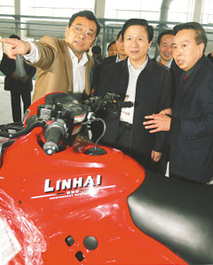 昨天(19日),在林海動力機(jī)械集團(tuán),江蘇省委書記梁保華饒有興致地參觀了該公司開發(fā)的摩托車、割草機(jī)、發(fā)電機(jī)等各式新產(chǎn)品。記者 于先云攝