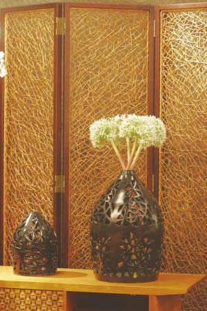 屏風的鏤空設(shè)計讓人眼前一亮,它摒棄了金子以往的鈍感與笨重,一眼望去,好像真金所制,華貴且不失精巧。采用的是藤藝編織技術(shù),藤制品本身略顯粗糙,但其金黃的表皮顏色彌補了這一缺憾,加之設(shè)計師在編織處理上顯得頗有條理,搭配原木框架讓整體設(shè)計渾然天成,整個屏風的金色表層略有劃痕,自然而不造作。