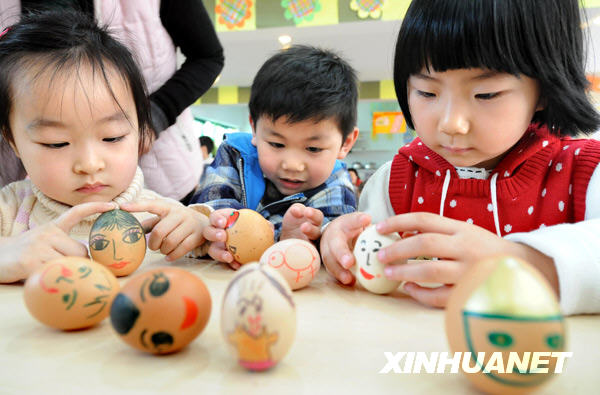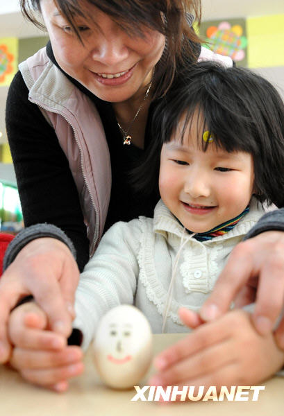 3月20日,南京市實驗幼兒園的老師在幫助小朋友立蛋。