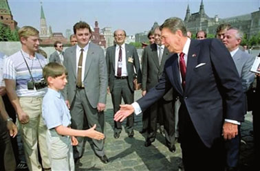 英國《每日電訊報》網(wǎng)站19日登出蘇扎拍攝于21年前的一張照片:里根訪問蘇聯(lián),在時任蘇聯(lián)領(lǐng)導(dǎo)人米哈伊爾·戈爾巴喬夫陪同下參觀莫斯科紅場,遇見一群蘇聯(lián)游客并與他們交談。