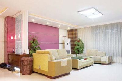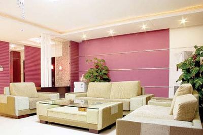 紫色背景墻最常用的地方是沙發(fā)背景墻。用紫色壁紙大面積鋪帖,只在柜式空調(diào)的后面留出相應(yīng)的白色部分,再用銀色金屬條橫著粘貼在壁紙上,既能保證整體色調(diào)的完整,又不會(huì)死板,而且銀色也是一種很高檔的顏色,整體看來(lái)很有品位。值得注意的是家具一定要選擇淺色的,不然客廳就會(huì)顯得很暗。