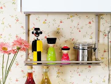 由一對(duì)紅色的俏皮的小老鼠組成的圖案,有規(guī)律地排列在純棉的鍋墊上,營(yíng)造出熱烈喜悅的氣氛。旁邊印有明黃色和粉紅色太陽花圖案的塑料案板具有磨砂的質(zhì)感,透出既朦朧又艷麗的表情。三只半透明的印花塑料碗,將淺色不透明的枝葉印花襯托得更加曼妙,配合操作臺(tái)處米黃底色的碎花圖案壁紙,讓鮮艷和生動(dòng)充滿廚房空間。