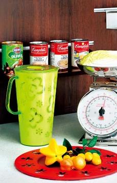 味黃綠色的塑料水杯內(nèi)的白色杯壁運(yùn)用了鏤空雕花的手法,花朵造型大方簡(jiǎn)單,充滿單純自然的氣質(zhì),旁邊的紅色塑料果盤鮮艷喜氣,盤沿比較寬,上面圍繞著一圈鏤空的抽象人形圖案,增加了果盤的時(shí)尚性。金屬材質(zhì)的多用架有很強(qiáng)的實(shí)用價(jià)值,底部同樣裝飾著鏤空人形圖案,將泛著柔和光澤的不銹鋼多用架映襯得更加精致,為廚房的操作空間增添新奇趣味。