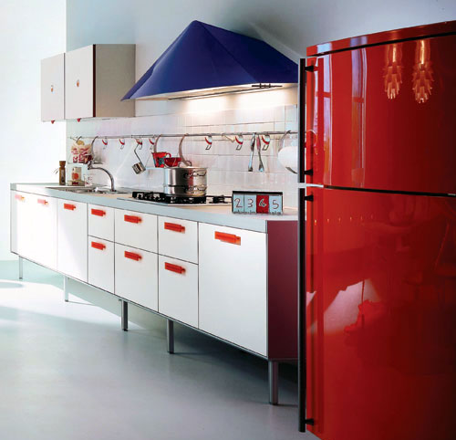 這無疑是一個(gè)調(diào)色高手的作品,采用經(jīng)典的白為底色,再配以同樣是經(jīng)典的藍(lán)和紅作為點(diǎn)綴,冷暖色調(diào)的沖突,卻帶出了極佳的視覺效果。原來,于傳統(tǒng)之中見時(shí)尚,不過就是給單調(diào)而普通的家電、櫥柜的把手、煙機(jī)的頂蓋,披上色彩的外衣而已。